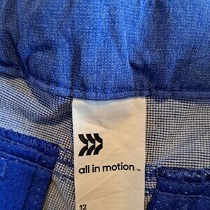 All in Motion boys size 12 blue shorts with adjustable waist, fabric has stretch, snap with zipper closure, front and back pockets