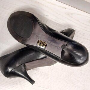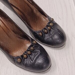 Miss Sixty all leather heels. Black crinkly look leather outer with gold leather inner. Rubber pad inset into the front sole for comfort and non slip easy wear. Unique vintage look with copper colored round buttons as per pic. Size 7. In great condition - inside and out.
