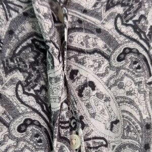 Stylish button-up shirt with a black and white paisley pattern. Features classic buttons for a timeless look.