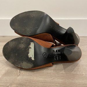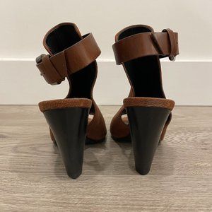 Ankle high heeled leather sandals with an open toe and heel.