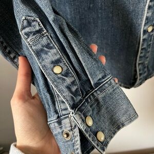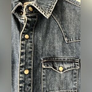 Dark wash denim shirt with classic collar. Perfect for layering.