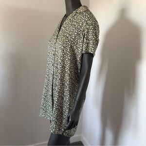 Chic and effortless AllSaints mini dress featuring a soft black base with allover yellow and white floral print. Button-down front, notched collar, and short sleeves. Can be styled loose or belted for a flattering silhouette. Lightweight and flowy – perfect for spring and summer!