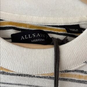 A reworked designer find ⚡️ This is the AllSaints Stanton short-sleeve crew in Chalk White, originally a men’s size Medium but professionally cut and hemmed into a cropped, boxy women’s fit. Features a luxe, soft-knit cotton blend with textured horizontal stripes in charcoal, mustard, and cream for that laid-back vintage vibe AllSaints is known for. Ribbed crew neckline, relaxed shoulders, and a breezy drape that pairs perfectly with high-waisted denim or linen trousers.