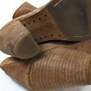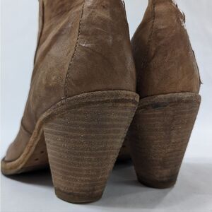 Distressed tan leather upper, inner ankle zip, stacked heel. Light wear, no flaws. Perfect color to wear with summer & fall florals. Think dresses!