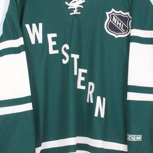 Officially licensed Authentic CCM XL 2004 Western Conference All-star team. Minnesota All-star game patch on right shoulder, neck tie and NHL crest on the upper left chest.