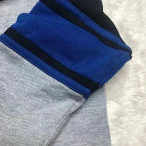Grey, black, and blue hoodie.