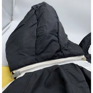 Stay warm and stylish with this vintage Allis-Chalmers Men's Winter Coat in size small. Made with durable nylon material, this mid-length parka features a hood for added protection, a full zip closure, and a classic black color that is perfect for casual or workwear occasions. Showcasing the iconic 80s theme, this coat is a must-have for fans of industrial heavy machinery and tractors. Whether you're out for a stroll or braving the winter weather, this Canadian-made coat is designed to keep you comfortable and looking great. Hood is removable- can be zipped off. Heavy duty Acme zipper. Coat is not heavily insulated- suitable for mild winter weather or fall/spring. Note: light stain on front - see last picture.
