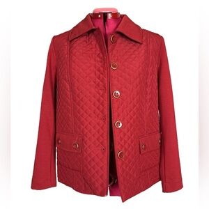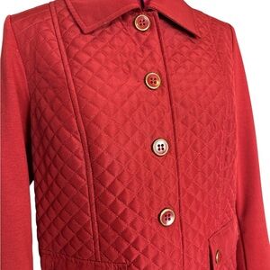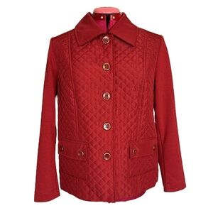 This sweater jacket features a quilted front and knit back with princess seams for a flattering fit. Two front button-up patch pockets, keyhole buttonholes and rimmed buttons offer nice finishing details. Excellent condition; scent free.