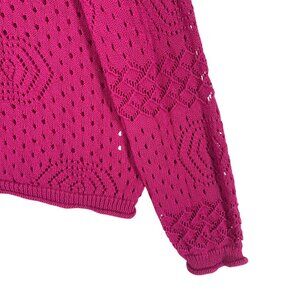 Elevate your wardrobe with this stunning Alison Sheri fuschia size xxl Long Sleeve Open Knit Sweater. Perfect for any occasion, this sweater has a stylish pullover design and is made with a cozy open-knit lace effect design fabric. The long sleeves fuschia color make it perfect for the winter, fall, and spring seasons.