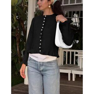 Alljoin Women Black Long Sleeve Solid Knit Cardigan Casual Crewneck Sweater
