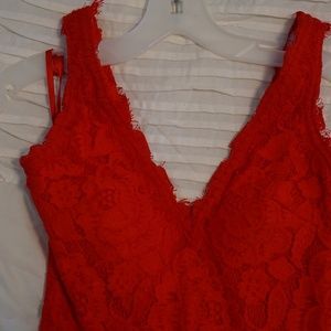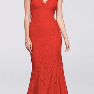 Allover Lace V-Neck Gown with Eyelash Trim Red
