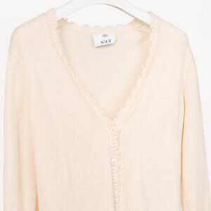 This cardigan from Allude is crafted with a wool and cashmere blend knit in a soft cream, and features long sleeves, a V-shaped neckline, front button closures; and distressed ribbed finishings on the cuffs, neckline, and banded hem.