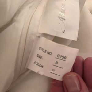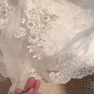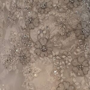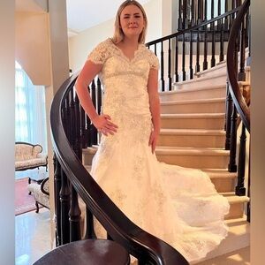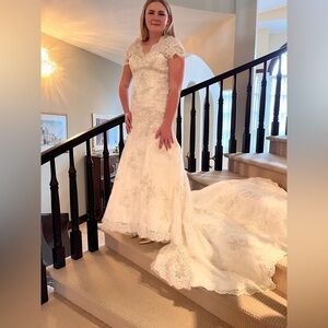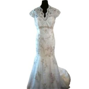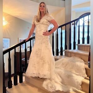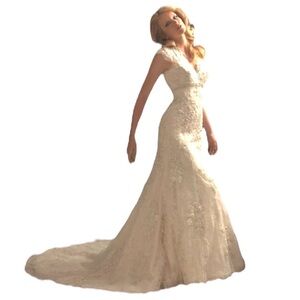 An absolute show stopper! Constructed from layers of lace appliqué and Swarovski crystals. The romantic silhouette features cap sleeves, and a v-shaped neckline accented with Swarovski crystals at the empire waist. The drama continues in the back with dainty buttons and a high lace neckline. Ivory gown fits close the body then flares into an fuller mermaid skirt. Floor length with longer train in the back. The workmanship and finish is stunning. Combined with the shape it makes for an elegant, sophisticated, and timeless gown. Excellent to like new condition. Please feel free to ask questions.