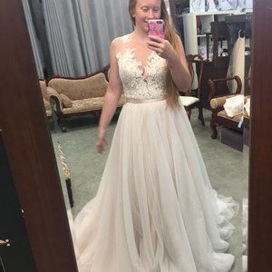 This is for a shop sample gown Allure Bridals "bridal" size 12 Bridal Gown in champagne/nude/ivory. It is a 2-piece! (the top and bottom are separates). This gown is a shop sample and has been tried on a handful of times in the shop. It is brand new with tags, has never been worn (other than for the pics and being tried on in the store), never altered, and shows no obvious marks or indications of having been tried on. It is in excellent sample condition.