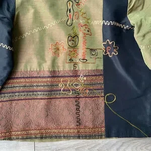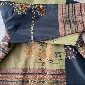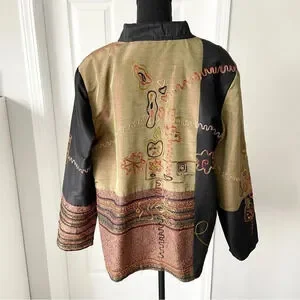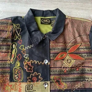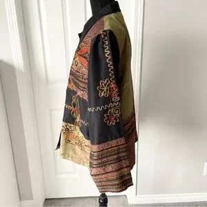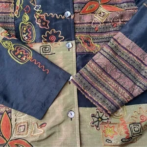 Eye-catching patchwork jacket by Allure. Button-front closure with a classic collar. Mixed embroidered and woven panels. Lightweight structured fabric. Bohemian-inspired floral and geometric motifs.