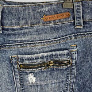 Almost Famous low‑rise denim cut‑off shorts feature a frayed high‑low hem with front whiskering, light distressing at the thighs and frayed pocket openings, a zip‑fly and branded button closure, and four functional zip‑pocket accents (two in front, two on the back)