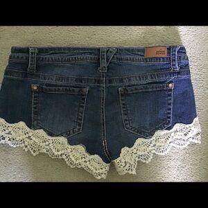 Jean shorts with pretty lace-trim detailing. In excellent shape. See pics for measurements.