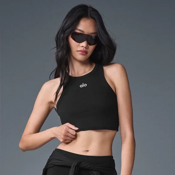 Sleek black tank by ALO Yoga. Ideal for workouts and everyday wear. Comfortable and stylish.