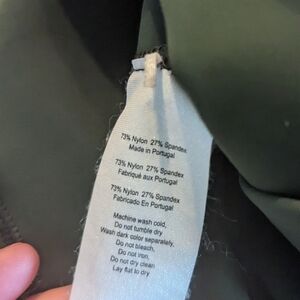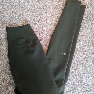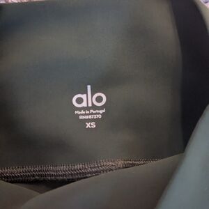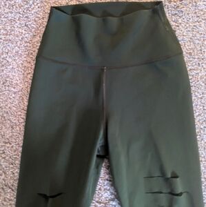 Cute pair of dark green high rise leggings from Alo. They have distress rips on the front of the leg that are all in tact and not stretched.