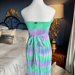 Super light and airy strapless purple and green tie dye maxi beach dress, one size fits all (S-L). Long flowy straps are adjustable to create different looks. Excellent used condition! One part of one strap has loose strings at the base but it does not affect its function, nor is it visible because it is underneath. Bust measures 14 inches laying flat (can easily stretch more), length of dress is 48.75 inches. Cat friendly, nonsmoking home.