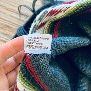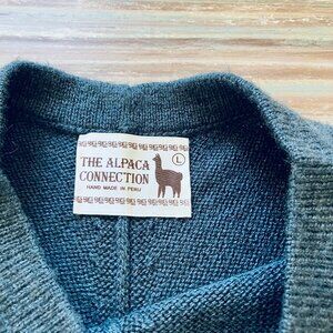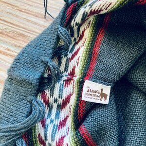 The Alpaca Connection knit poncho in grey with patterned design along the bottom edge, with fringe tassel trim. 100% alpaca wool, hand made in Peru. Hand wash or dry clean only. Tag size "Large" - see below for garment measurements. Pre-owned condition: knit fabric has some pilling from normal wash/wear.