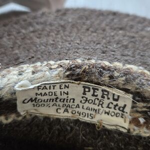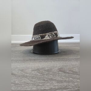 Elegant dark brown hat with a distinctive woven design. Features a patterned band for added style. Size small-medium - 21.5 inch