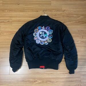 Stylish black bomber jacket by Alpha Industries. Features iconic NASA patches and a sleek design. Perfect for casual wear.