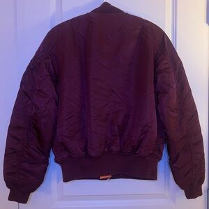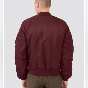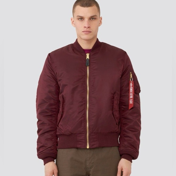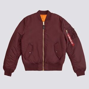Classic Alpha Industries bomber jacket in a rich burgundy tone. Inspired by the original jackets worn by Air Force and Navy pilots in the 1950’s, the MA-1 bomber jacket with orange lining is the perfect take on a classic bomber silhouette.