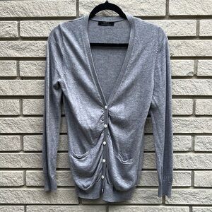 Grey knit cardigan by Alpha Massimo Rebecchi. Gathered along the front for a flattering (and forgiving) fit. This tailored cardigan has a v neck front and ribbed sleeve cuffs and bottom hem.