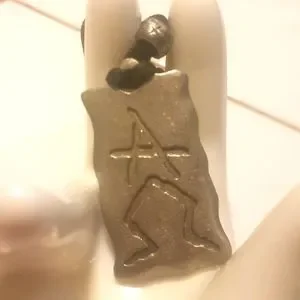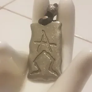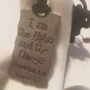 Metal rune stone tablet pendant necklace w/ the symbols for Alpha & Omega on the front & Revelation scripture on the back