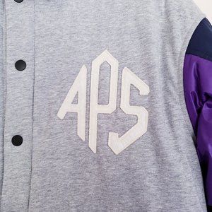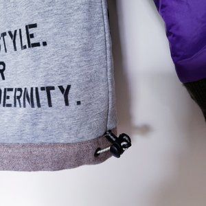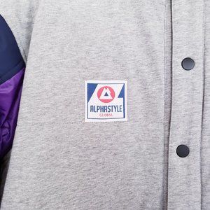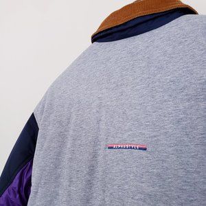 Fabrics mix and match and colour blocking design. Various featured embroideries and patch labels. Seamless rib cuffs