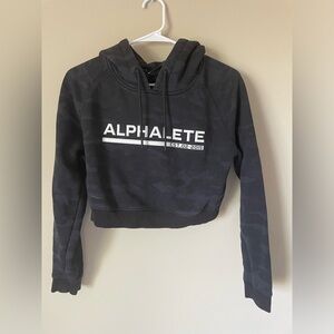Dark hoodie with Alphalete branding. Comfortable and stylish.