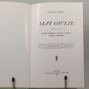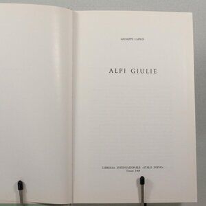 This vintage Italian language book is "Alpi Giulie" by G. Caprin, originally published in 1895, this is a 1969 reproduction by Libreria Internazioale (Italo Svevo) in Trieste. It is a decorated cloth covered hard back edition, faithful to the original.