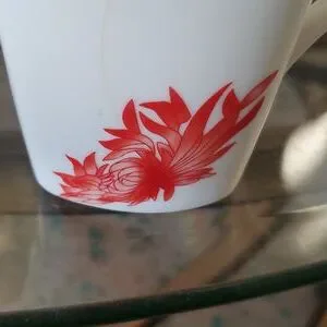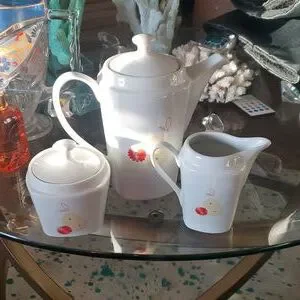 Elegant white tea set with red floral design. Includes teapot, creamer, and sugar bowl.