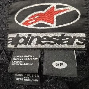 Men's size 58 fits as an xl, leather with warm lining as well as all the padding for motorcycling safety. Great shape with minimal wear.