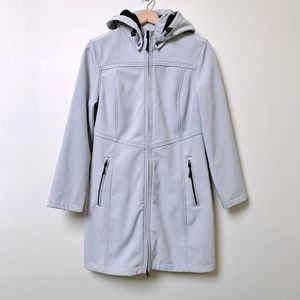 Light jacket perfect for spring. Water resistant shell with light fleece lining. Zipper pockets and hood. Off white - silvery colour with black lining.