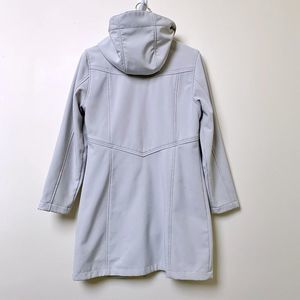 Light jacket perfect for spring. Water resistant shell with light fleece lining. Zipper pockets and hood. Off white - silvery colour with black lining.