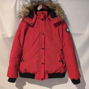 Stylish red jacket with fur-trimmed hood. Features button closure and logo patch on sleeve. Perfect for cold weather.