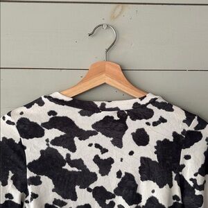 Standout style with a playful twist. This Altar’d State long sleeve features a bold black-and-white cow print in a soft, lightweight knit. Designed with a slightly cropped cut and a pointed front hem that draws the eye and creates a super flattering fit.