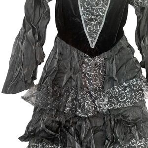 Gothic glamour meets dramatic flair in this Alterego Deluxe Vampire Dress 👻 Perfect for Halloween, cosplay, or themed parties, this women’s size large costume features layered black lace, sheer bell sleeves, and a regal high collar for a striking silhouette. Daring front slit and fishnet-ready legs make it both haunting and hot. Comes in excellent condition, ready to slay the night 🦇🖤