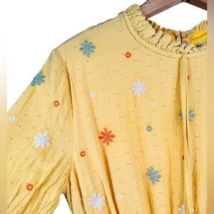 Medium relaxed fit long sleeve maxi dress, beautiful lightweight fabric, high neck, modest, embroidered flowers on the blouse part. Neck tie with fun tassels. Excellent preowned condition, size 42/Medium
