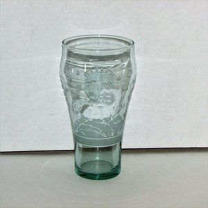 Vintage beverage glass with Coca-Cola logo on front, Santa with a raised soda bottle on back, snowflakes all around.