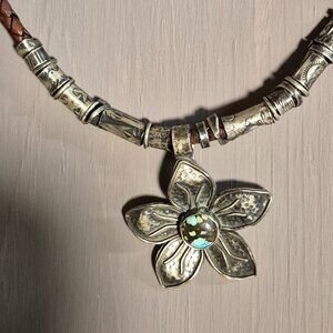 A beautiful unique Boho type necklace. It is a substantial leather cord with sterling silver rings as shown. Purchased from local artisan who sells on ETSY. The sterling silver flower is 2 inches in size. Center is turquoise gem stone. One of the pics shows a similar necklace on sale by same artist now. Selling for $290. Smoke and pet free home