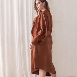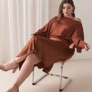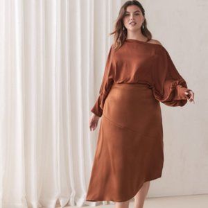 Amazing asymmetrical satin skirt in rust brown (so on trend!!). Very sexy when paired with balloon sleeve blouse for a tone-on-tone look (see my other listings for blouse). This would make a great look for the upcoming holiday season!!