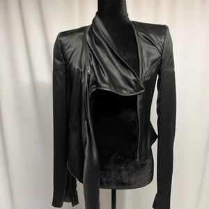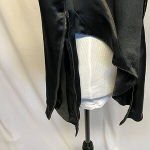 This cool cropped jacket looks great from every angle. It is a soft satin with sexy zipper details. I love the subtlety of the zippers - they don't stand out but add to the sleek cut. The zippers can be used any way you want and the zippers on the arms can be zipped tight or opened for more movement. The label says size 36 but this is a small jacket - size XXXS