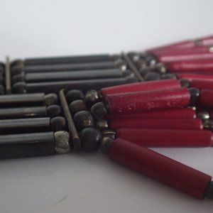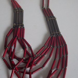 Amazing Tribal Multi Strand Elongated Oxblood Red Horn & Pewter Beaded Necklace