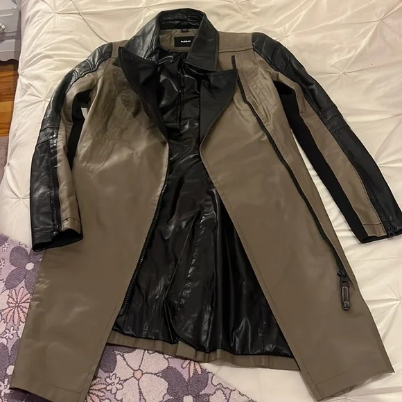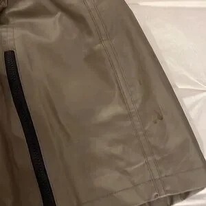 Literally never worn but there is a coffee stain in the back (see picture). Comes with the protective bag. Size XS. Army green color with leather
