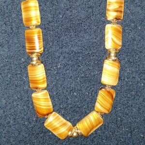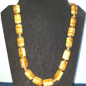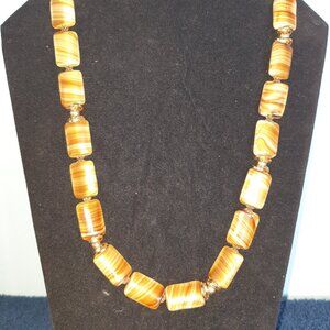 This brown agate gold-tone beaded necklace is a rare estate find. It measures 23 inches and has 18 rectangular-shaped brown agate glass beads. The necklace is in excellent vintage condition and would be an amazing addition to any vintage Art Deco jewellery collection.