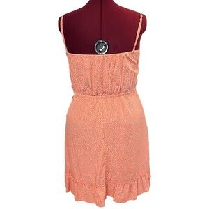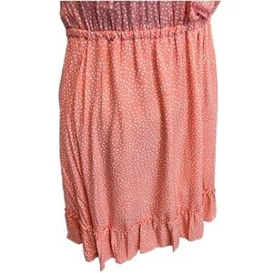 Just a pretty, easy pink with white polka dot pull over dress. Faux wrap top with adjustable spaghetti straps. Elastic waist and fuller skirt with ruffle hem. Light and cool poly-cotton blend material. Perfect for a hot summer day! Purchased from Amazon and unbranded.