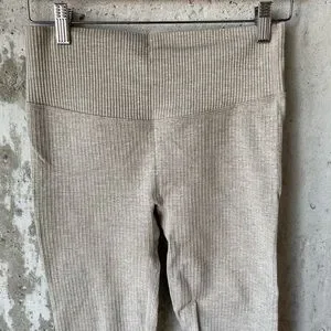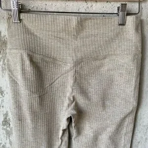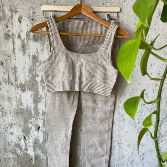 Amazon workout set. Ribbed beige stretchy workout bra and leggings. Large size fits tight but has good stretch. Worn twice very good condition. Has dipped back stitching to accentuate curves.